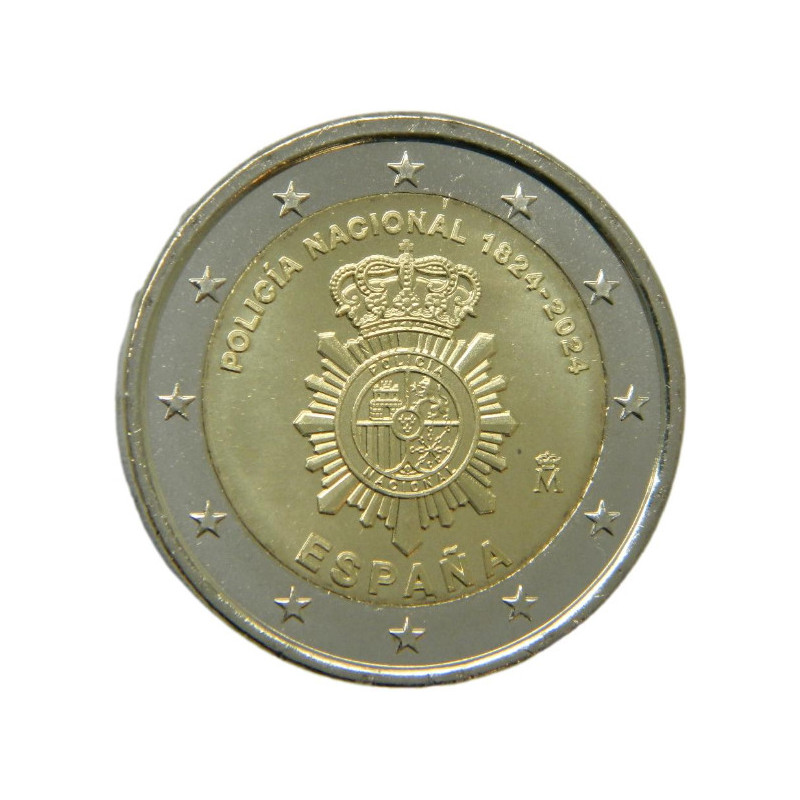 En la parte superior, en sentido circular y en mayúsculas, la leyenda POLICÍA NACIONAL 1824-2024; a su derecha, la marca de Ceca. En la parte inferior, en sentido circular y en mayúsculas, la leyenda ESPAÑA. Rodeando todos los motivos y leyendas, en la zona circular exterior de la moneda, aparecen las doce estrellas de la Unión Europea.