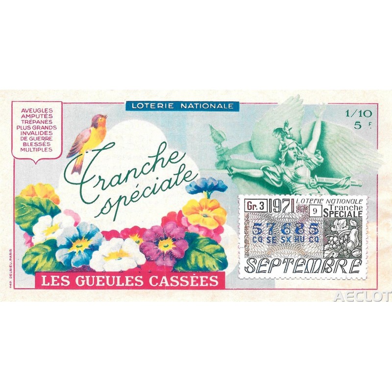 Les Gueules Cassées. Entre 1931 y 1933, los "Gueules Cassées", asociados a "The Broken Wings" y las otras asociaciones de víctimas de la guerra (los Amputés de Guerre, los Ciegos de Guerra, los Mutilados de los Ojos, los Mayores Inválidos ...) lanzaron una subscripción nacional acompañada de un Sorto que se llamará "La Deuda". El primer boleto se presentó solemnemente a Sr. Gaston Doumergue, presidente de la República, durante su visita a la finca Moussy-le-Vieux. Esta rifa tuvo una salida considerable.Los lotes van desde bicicletas hasta aviones de pasajeros !!!