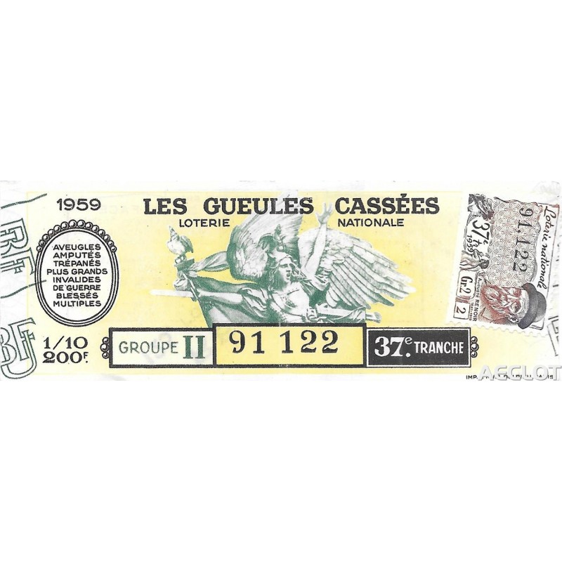 Les Gueules Cassées. Entre 1931 y 1933, los "Gueules Cassées", asociados a "The Broken Wings" y las otras asociaciones de víctimas de la guerra (los Amputés de Guerre, los Ciegos de Guerra, los Mutilados de los Ojos, los Mayores Inválidos ...) lanzaron una subscripción nacional acompañada de un Sorto que se llamará "La Deuda". El primer boleto se presentó solemnemente a Sr. Gaston Doumergue, presidente de la República, durante su visita a la finca Moussy-le-Vieux. Esta rifa tuvo una salida considerable.Los lotes van desde bicicletas hasta aviones de pasajeros !!!