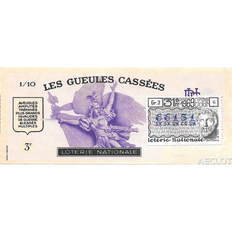 Les Gueules Cassées. Entre 1931 y 1933, los "Gueules Cassées", asociados a "The Broken Wings" y las otras asociaciones de víctimas de la guerra (los Amputés de Guerre, los Ciegos de Guerra, los Mutilados de los Ojos, los Mayores Inválidos ...) lanzaron una subscripción nacional acompañada de un Sorto que se llamará "La Deuda". El primer boleto se presentó solemnemente a Sr. Gaston Doumergue, presidente de la República, durante su visita a la finca Moussy-le-Vieux. Esta rifa tuvo una salida considerable.Los lotes van desde bicicletas hasta aviones de pasajeros !!!