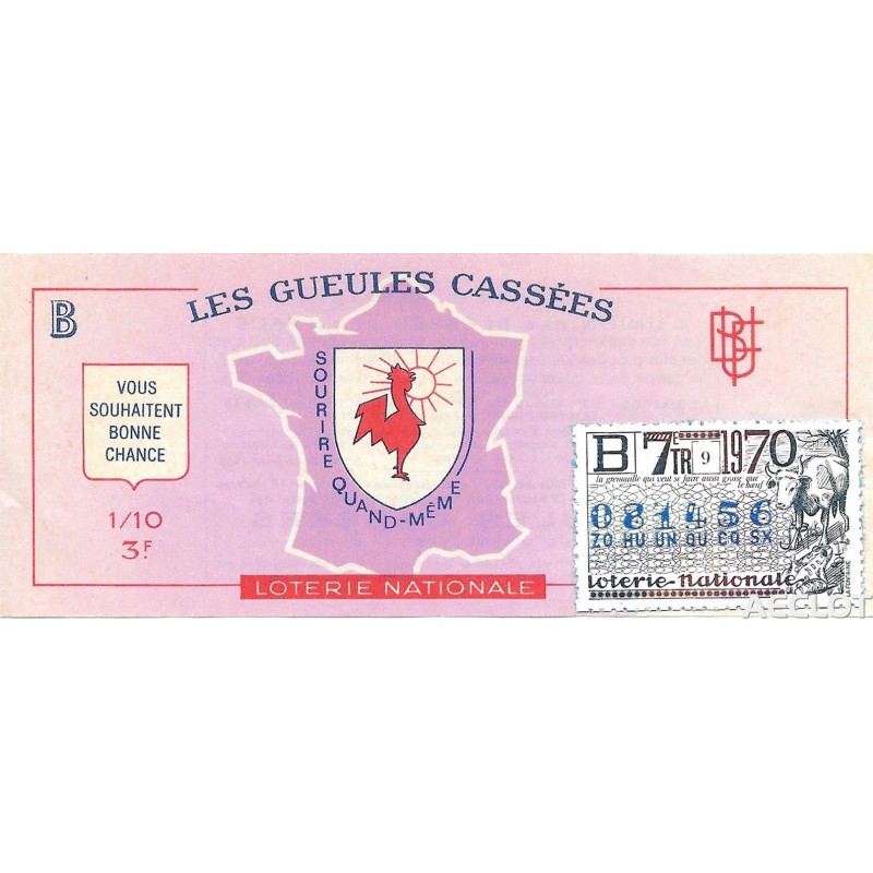 Les Gueules Cassées. Entre 1931 y 1933, los "Gueules Cassées", asociados a "The Broken Wings" y las otras asociaciones de víctimas de la guerra (los Amputés de Guerre, los Ciegos de Guerra, los Mutilados de los Ojos, los Mayores Inválidos ...) lanzaron una subscripción nacional acompañada de un Sorto que se llamará "La Deuda". El primer boleto se presentó solemnemente a Sr. Gaston Doumergue, presidente de la República, durante su visita a la finca Moussy-le-Vieux. Esta rifa tuvo una salida considerable.Los lotes van desde bicicletas hasta aviones de pasajeros !!!