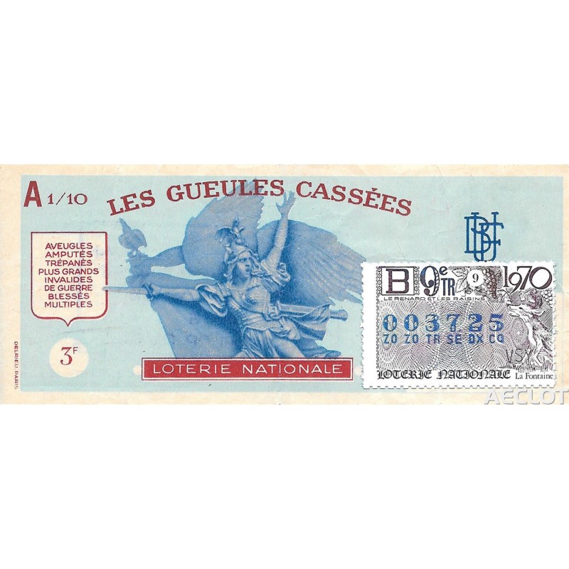 Les Gueules Cassées. Entre 1931 y 1933, los "Gueules Cassées", asociados a "The Broken Wings" y las otras asociaciones de víctimas de la guerra (los Amputés de Guerre, los Ciegos de Guerra, los Mutilados de los Ojos, los Mayores Inválidos ...) lanzaron una subscripción nacional acompañada de un Sorto que se llamará "La Deuda". El primer boleto se presentó solemnemente a Sr. Gaston Doumergue, presidente de la República, durante su visita a la finca Moussy-le-Vieux. Esta rifa tuvo una salida considerable.Los lotes van desde bicicletas hasta aviones de pasajeros !!!