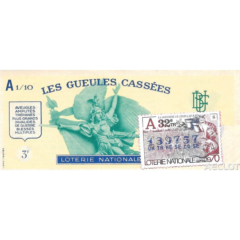 Les Gueules Cassées. Entre 1931 y 1933, los "Gueules Cassées", asociados a "The Broken Wings" y las otras asociaciones de víctimas de la guerra (los Amputés de Guerre, los Ciegos de Guerra, los Mutilados de los Ojos, los Mayores Inválidos ...) lanzaron una subscripción nacional acompañada de un Sorto que se llamará "La Deuda". El primer boleto se presentó solemnemente a Sr. Gaston Doumergue, presidente de la República, durante su visita a la finca Moussy-le-Vieux. Esta rifa tuvo una salida considerable.Los lotes van desde bicicletas hasta aviones de pasajeros !!!