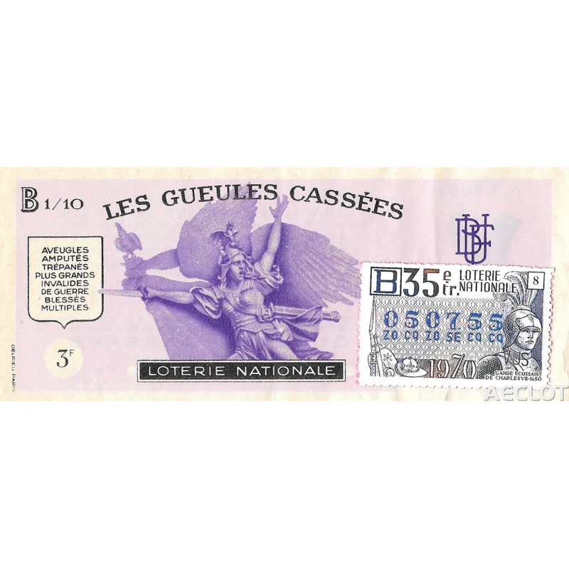 Les Gueules Cassées. Entre 1931 y 1933, los "Gueules Cassées", asociados a "The Broken Wings" y las otras asociaciones de víctimas de la guerra (los Amputés de Guerre, los Ciegos de Guerra, los Mutilados de los Ojos, los Mayores Inválidos ...) lanzaron una subscripción nacional acompañada de un Sorto que se llamará "La Deuda". El primer boleto se presentó solemnemente a Sr. Gaston Doumergue, presidente de la República, durante su visita a la finca Moussy-le-Vieux. Esta rifa tuvo una salida considerable.Los lotes van desde bicicletas hasta aviones de pasajeros !!!