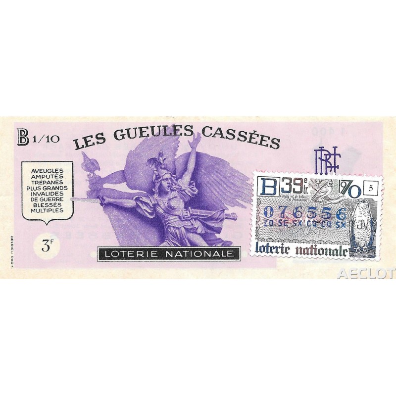 Les Gueules Cassées. Entre 1931 y 1933, los "Gueules Cassées", asociados a "The Broken Wings" y las otras asociaciones de víctimas de la guerra (los Amputés de Guerre, los Ciegos de Guerra, los Mutilados de los Ojos, los Mayores Inválidos ...) lanzaron una subscripción nacional acompañada de un Sorto que se llamará "La Deuda". El primer boleto se presentó solemnemente a Sr. Gaston Doumergue, presidente de la República, durante su visita a la finca Moussy-le-Vieux. Esta rifa tuvo una salida considerable.Los lotes van desde bicicletas hasta aviones de pasajeros !!!