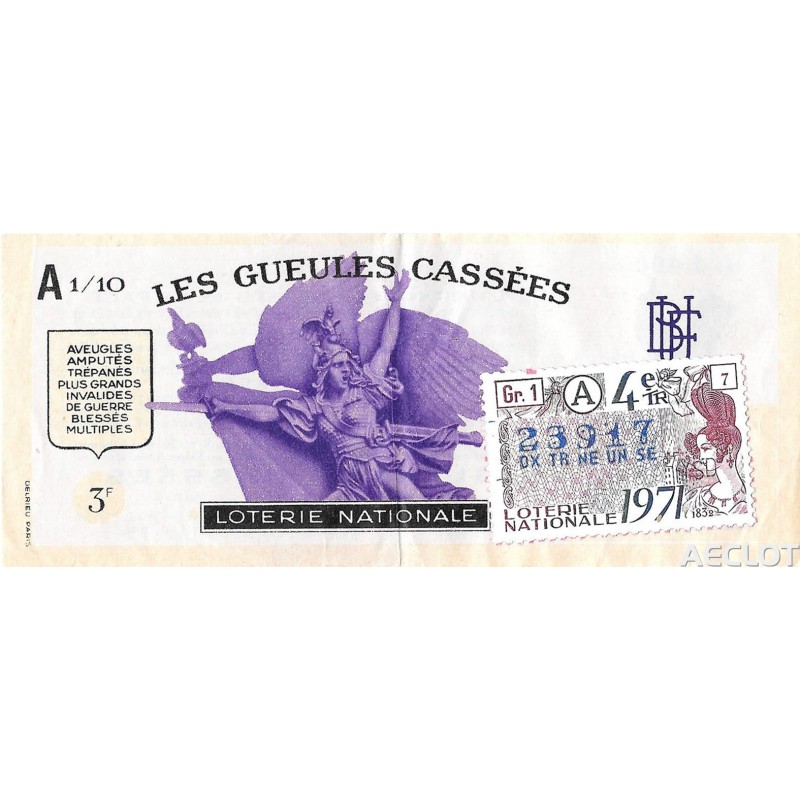 Les Gueules Cassées. Entre 1931 y 1933, los "Gueules Cassées", asociados a "The Broken Wings" y las otras asociaciones de víctimas de la guerra (los Amputés de Guerre, los Ciegos de Guerra, los Mutilados de los Ojos, los Mayores Inválidos ...) lanzaron una subscripción nacional acompañada de un Sorto que se llamará "La Deuda". El primer boleto se presentó solemnemente a Sr. Gaston Doumergue, presidente de la República, durante su visita a la finca Moussy-le-Vieux. Esta rifa tuvo una salida considerable.Los lotes van desde bicicletas hasta aviones de pasajeros !!!