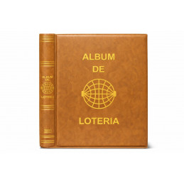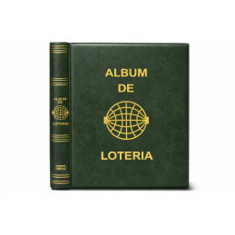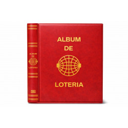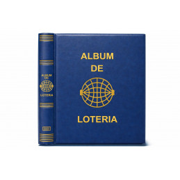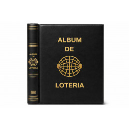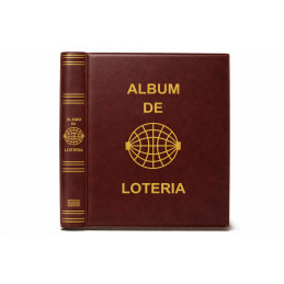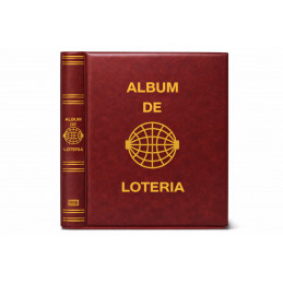 Álbum para décimos de Lotería Nacional fabricado en polipiel, acolchado y grabado mediante serigrafía en lomo y portada, con letras y dibujos en color oro. Sistema de 4 anillas con facilidad y comodidad en la apertura. Cajetín protector del mismo material que el album o en cartón rígido, con medidas de 270x330 mm. Disponible en varios colores: azul, verde, rojo, cuero, beige, negro y granate.