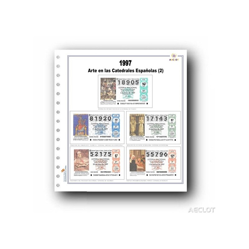 Juego de 5 hojas marca AECLOT impresas a todo color por doble cara, taladradas para álbum de 15 anillas, con fundas efecto cristal sin ácidos ni plastificantes y abiertas por la parte superior y un lateral para introducir el décimo con mas facilidad. También pueden suministrarse para álbum de 4 anillas.