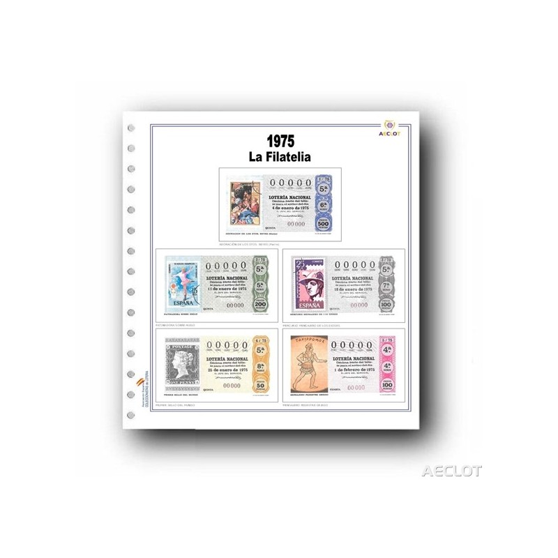 Hojas para coleccionar y colocar los 49 décimos distintos sorteados en 1975 dedicados a: Filatelia (I).