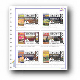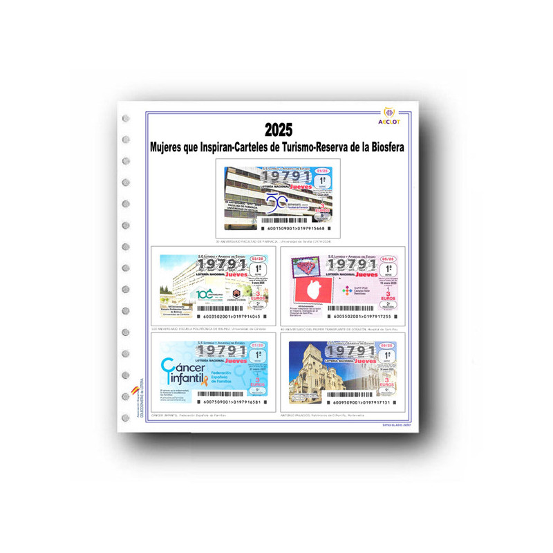 Juego de 5 hojas marca AECLOT impresas a todo color por doble cara, taladradas para álbum de 15 anillas, con fundas efecto cristal sin ácidos ni plastificantes y abiertas por la parte superior y un lateral para introducir el décimo con mas facilidad. También pueden suministrarse para álbum de 4 anillas.
